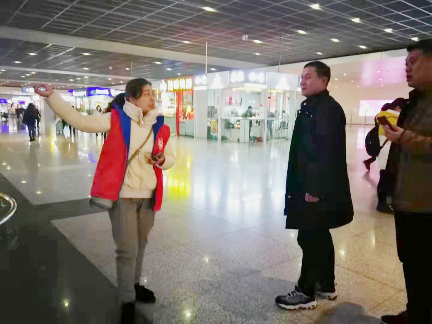 鄭州高鐵站一樓大廳樓層很高,東西南北四個(gè)方向有多個(gè)出入口,大門敞開,而且一樓大廳沒有供暖,冷風(fēng)嗖嗖,似乎比室外還要冷,但是,參加活動(dòng)的志愿者們?yōu)檫^往旅客提供的無私幫助,從而收獲了被助者由衷的謝意和回報(bào)的微笑,他們的內(nèi)心不由得也暖和了起來……