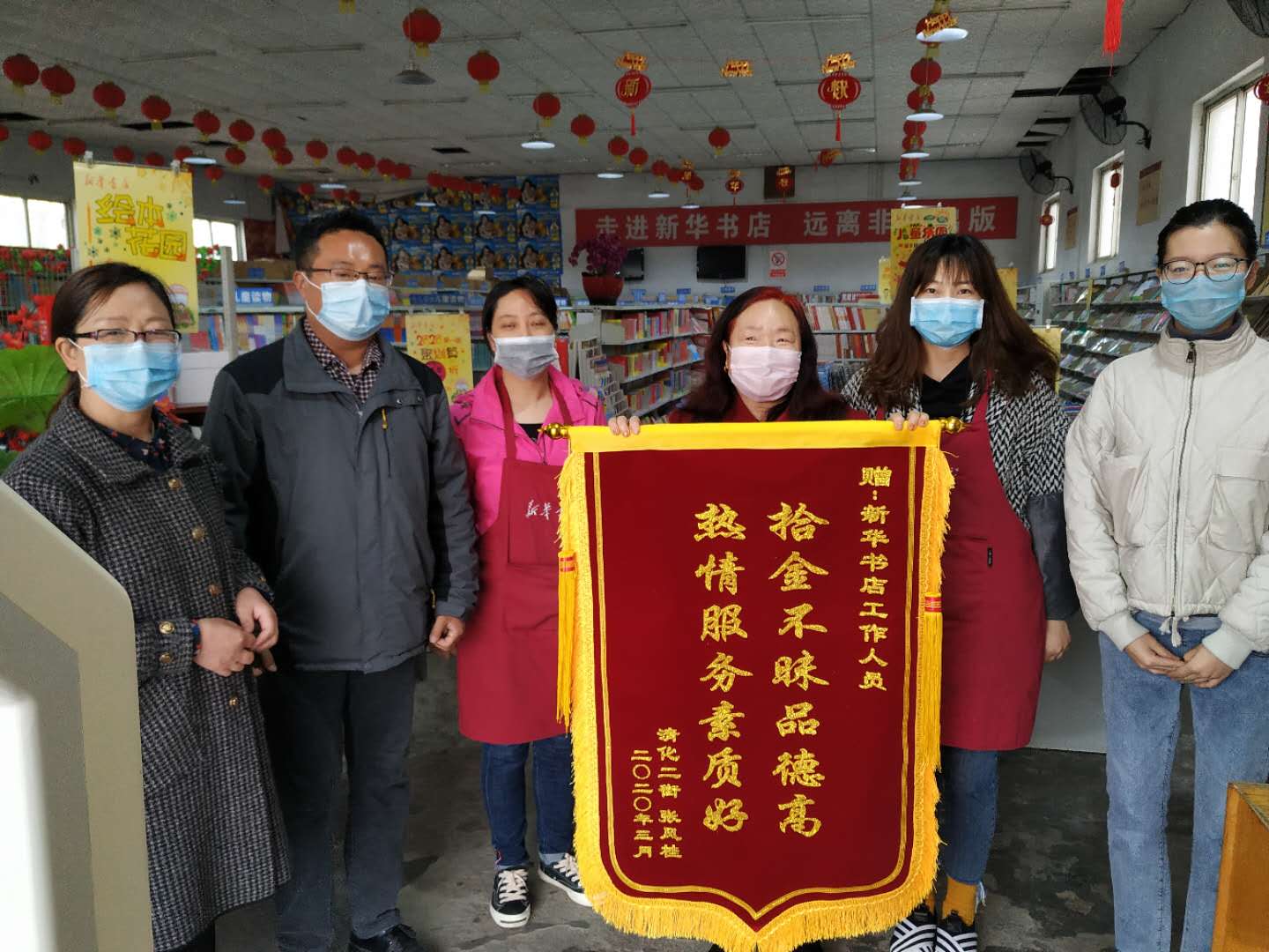 3月26日上午,清化鎮(zhèn)二街的張風(fēng)桂女士帶著印有“拾金不昧品德高、熱情服務(wù)素質(zhì)好”的錦旗送到博愛(ài)縣新華書(shū)店門(mén)市部,并為博愛(ài)縣新華書(shū)店的職工素質(zhì)點(diǎn)贊。