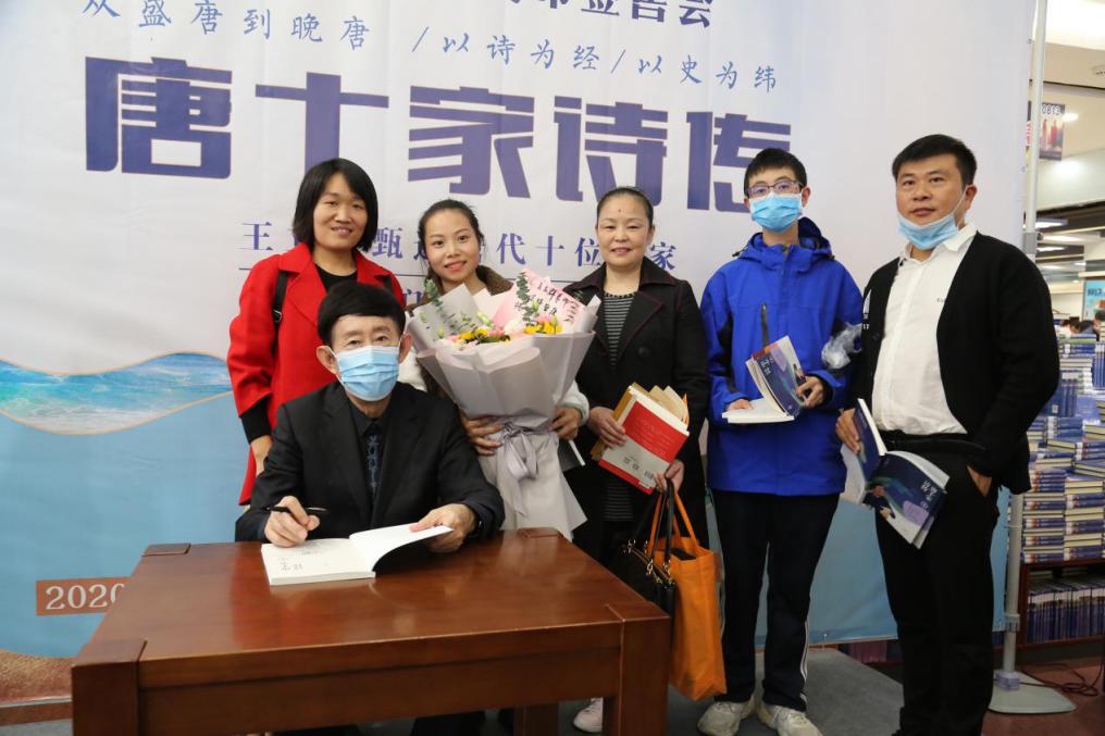 為了能與王立群先生面對(duì)面交流,上千名讀者一早來(lái)到鄭州購(gòu)書(shū)中心排隊(duì)等候,還有不少讀者從外地專程趕來(lái),有來(lái)自滎陽(yáng)的詩(shī)詞愛(ài)好者,也有來(lái)自重慶的“鐵桿”書(shū)粉。王立群與讀者們真誠(chéng)地分享了該書(shū)選取的主要人物,從盛唐到晚唐,以詩(shī)為經(jīng),以史為緯,深刻的解讀了一代詩(shī)人的廟堂江湖夢(mèng)。在新書(shū)發(fā)布會(huì)上,王立群說(shuō),以往的唐代詩(shī)歌作品解讀類書(shū)籍,一般是通過(guò)介紹單篇作品進(jìn)行人物或作品解讀,就像一顆顆珍珠沒(méi)有串成線。在新書(shū)《唐十家詩(shī)傳》中,他在唐代眾多詩(shī)人中選了十位詩(shī)人,將這些詩(shī)人的人生,用文學(xué)散文筆法介紹其人生重要節(jié)點(diǎn)的代表作,并一一解讀,好比把一顆顆珍珠似的作品以詩(shī)人生平為線串連起來(lái),側(cè)重講述創(chuàng)作的時(shí)間、地點(diǎn)、創(chuàng)作的緣由;顒(dòng)現(xiàn)場(chǎng),王立群還與讀者朋友進(jìn)行了親切的互動(dòng),對(duì)讀者提出的問(wèn)題,他以一個(gè)長(zhǎng)輩的身份,從專業(yè)的角度進(jìn)行了解答,現(xiàn)場(chǎng)掌聲不斷。