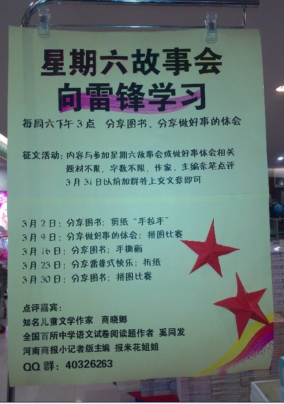 伴隨著春節(jié)長假的遠(yuǎn)去,三月份如期而至,同時該月又是學(xué)雷鋒月,鄭州市店為大力弘揚雷鋒精神,充分利用自身營銷品牌——“星期六故事會”這一平臺,開展為期一個月的“向雷鋒學(xué)習(xí)”主題活動。