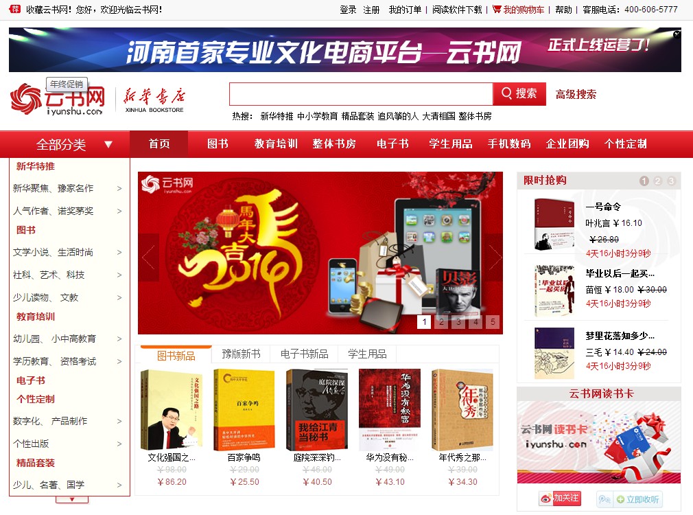 河南省新華書店發(fā)行集團(tuán)“云書網(wǎng)”是貫徹落實黨的十八屆三中全會關(guān)于文化大發(fā)展大繁榮的精神和省委省政府建設(shè)智慧城市的要求,由中原出版?zhèn)髅郊瘓F(tuán)全力打造的河南首家專業(yè)文化電商。