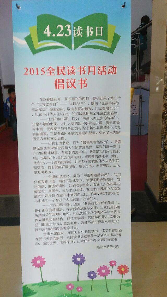 為更好營(yíng)造書(shū)香社會(huì),促進(jìn)社會(huì)閱讀風(fēng)尚的形成,提升民族文化素質(zhì),推進(jìn)學(xué)習(xí)型城市建設(shè),提高我店綜合收益,在4月23日世界讀書(shū)日來(lái)臨之際,新密市新華書(shū)店發(fā)出了2015年全民讀書(shū)月活動(dòng)倡議書(shū),提出了“美麗四月天,相約讀書(shū)日”閱讀主題,全力搞好宣傳,確;顒(dòng)取得實(shí)效,該店利用電子顯示屏、張貼海報(bào)、賣(mài)場(chǎng)布置等手段進(jìn)行宣傳,營(yíng)造氛圍,并積極組織開(kāi)展流動(dòng)售書(shū)活。