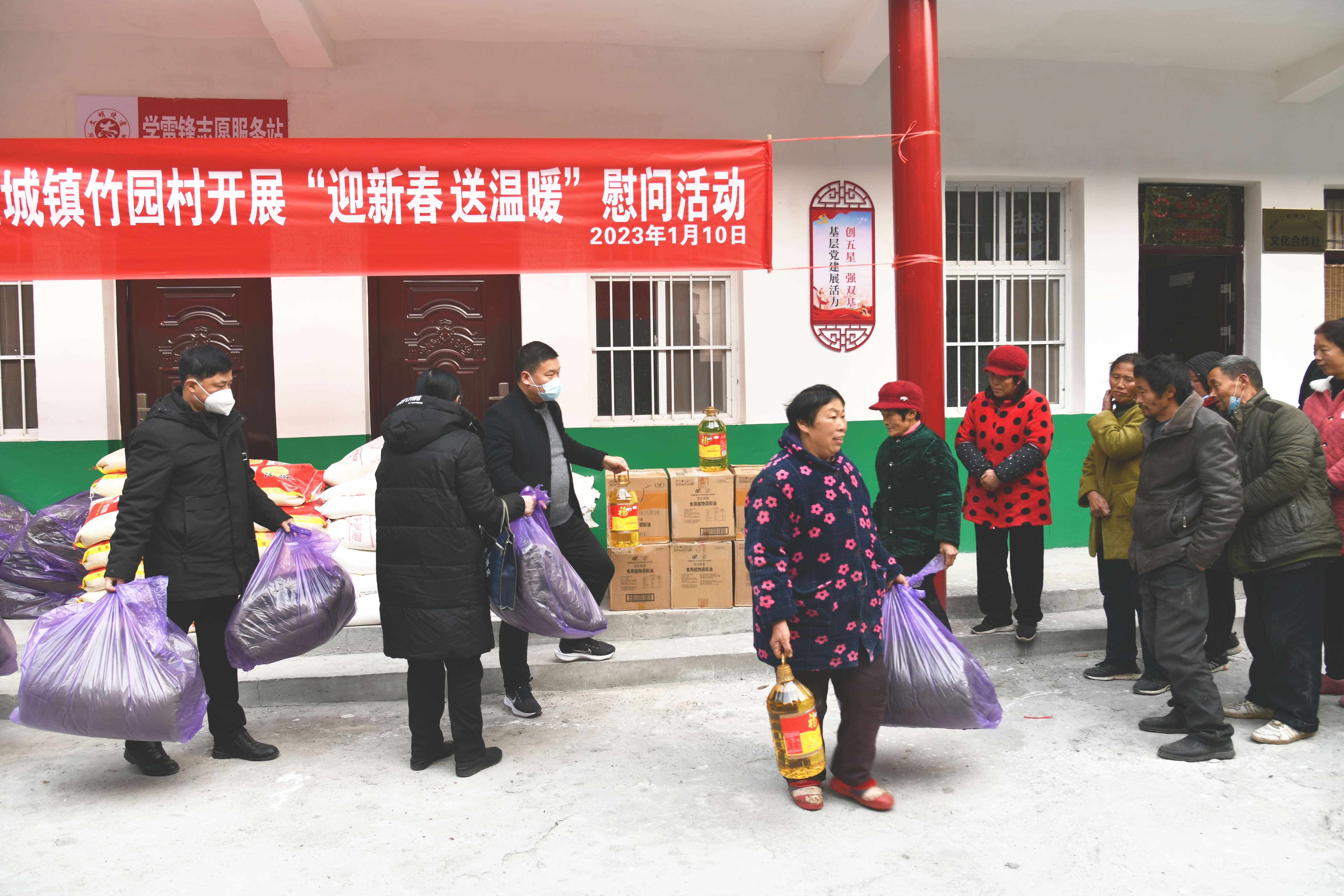 西峽縣竹園村是南陽市新華書店結(jié)對幫扶的省級貧困村。歷經(jīng)近十年的扶貧攻堅,如期實現(xiàn)整村脫貧摘帽,并榮獲市級文明村鎮(zhèn)、國家級森林村等榮譽稱號,如今又跨入了鄉(xiāng)村振興的新賽道。此次慰問書店購置了米、面、油、棉被等豐盛年貨,對已脫貧的24戶村民進行新年慰問,又捐助48噸水泥用于修繕村支部辦公用房。
