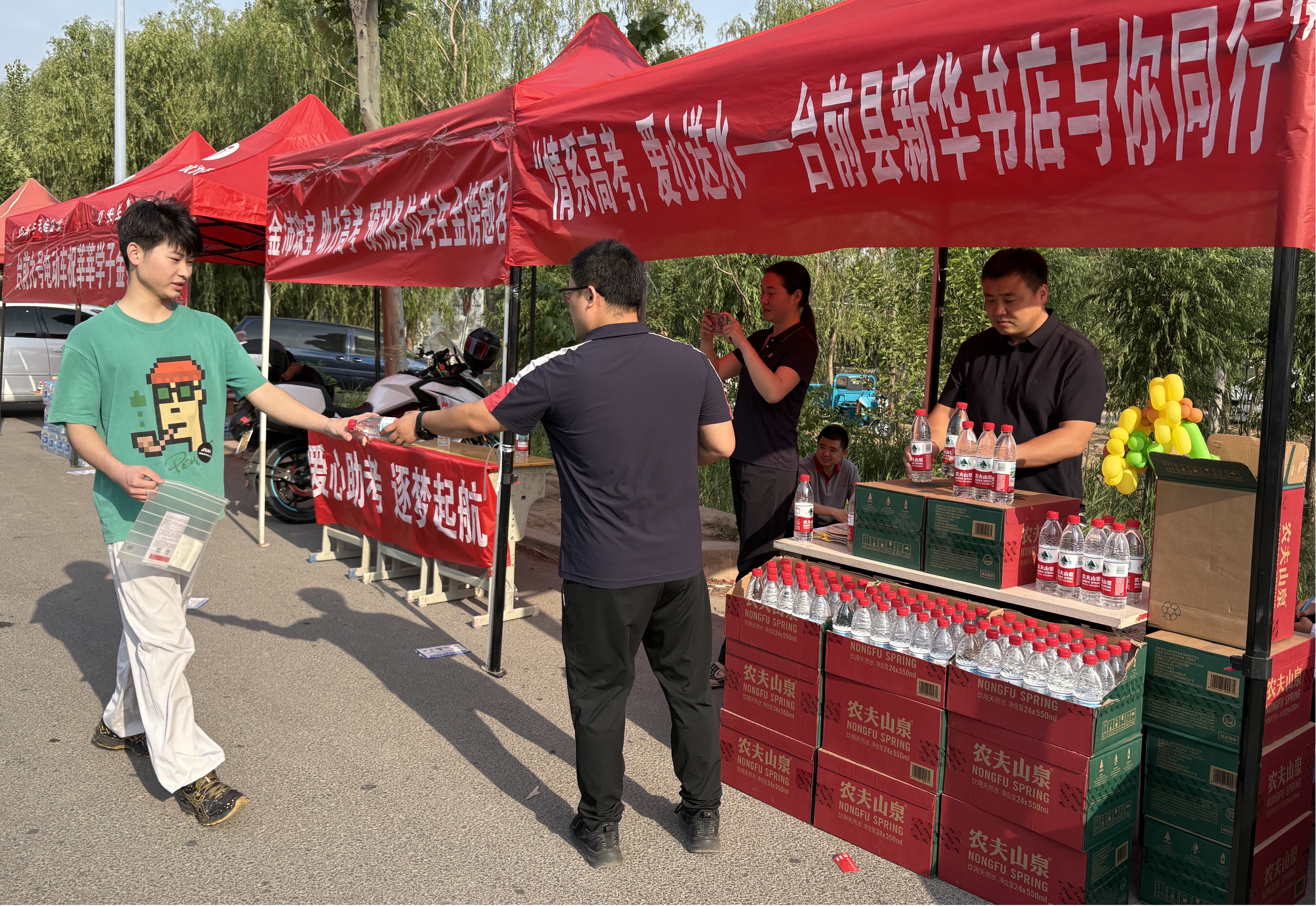 6月7日,高考首日,臺(tái)前縣新華書店在縣第一高級(jí)中學(xué)考場(chǎng)門口設(shè)立“愛心助考志愿服務(wù)臺(tái)”,為考生提供免費(fèi)飲用水,以實(shí)際行動(dòng)為學(xué)子們送上清涼關(guān)懷與誠(chéng)摯祝福,助力他們以最佳狀態(tài)迎戰(zhàn)高考。以點(diǎn)滴關(guān)懷緩解暑熱,用真誠(chéng)行動(dòng)傳遞溫暖,考點(diǎn)邊的“新華紅”成為高考期間一道溫暖人心的風(fēng)景線。